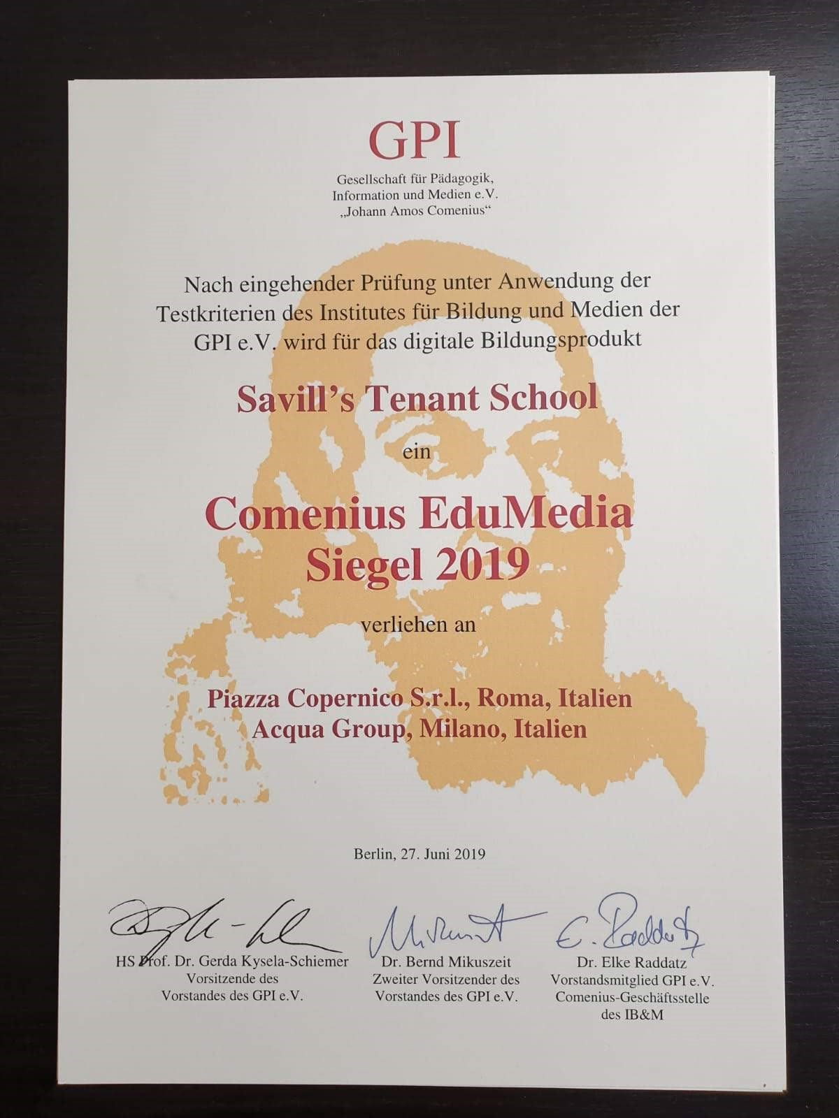 Nella Edizione 2019 del Premio COMENIUS EduMedia l’azienda e-learning di Roma PIAZZA COPERNICO e ACQUA GROUP si sono aggiudicate un Comenius-EduMedia-Siegel.